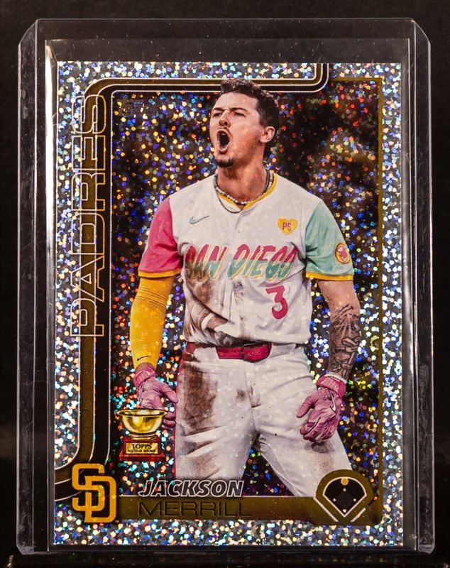 The Jackson Merrill 2025 Topps #125 Confetti card is 1 of 219 Jackson Merrill's card variations in the 2025 Topps set being tracked by Sports Card Investor, including Base, Aqua Holo Foil, Diamante Foil, Holo Foil, and Pink Diamante Foil.