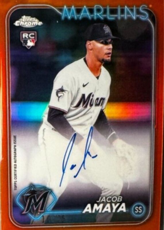 The Jacob Amaya 2024 Topps Chrome #RA-JAM Rookie Autographs - Orange Refractor /25 card in Raw condition has not changed in price in the last 30 days and was last sold for $39.99 .