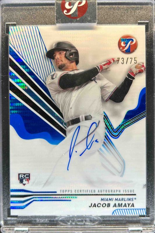 The Jacob Amaya 2024 Topps Pristine #PA-JAM Pristine Autographs - Blue Pristine Refractor /75 Rookie card is 1 of 26 Jacob Amaya's card variations in the 2024 Topps Pristine set being tracked by Sports Card Investor, including Base, Pristine Refractor, Refractor, Green Refractor /150, and Pristine Purple Refractor /99.