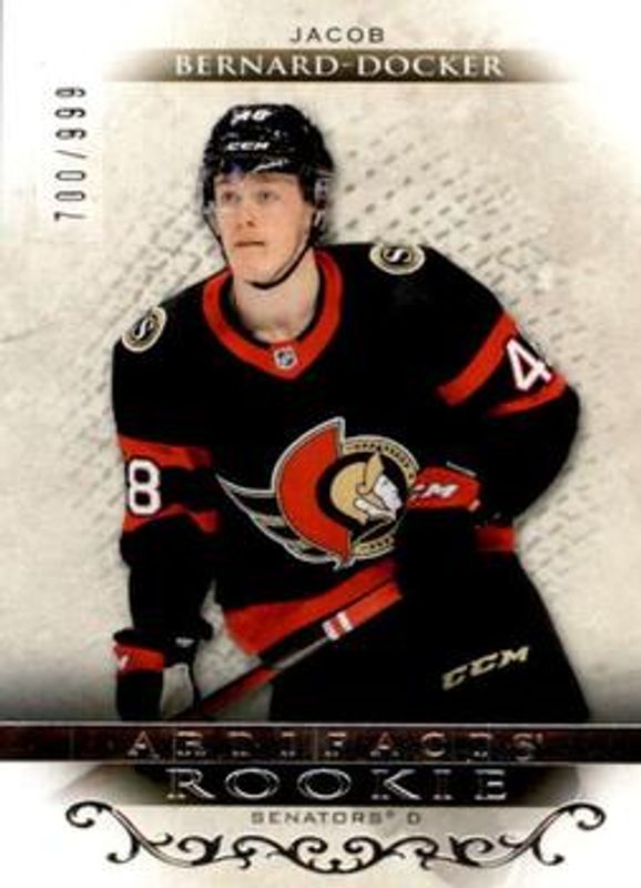 The Jacob Bernard-Docker 2021 Upper Deck Artifacts #170 Base /999 Rookie card is 1 of 27 Jacob Bernard-Docker's card variations in the 2021 Upper Deck Artifacts set being tracked by Sports Card Investor, including Neon Green, Rose Gold, Turquoise, Ruby /499, and Silver Spectrum /299.