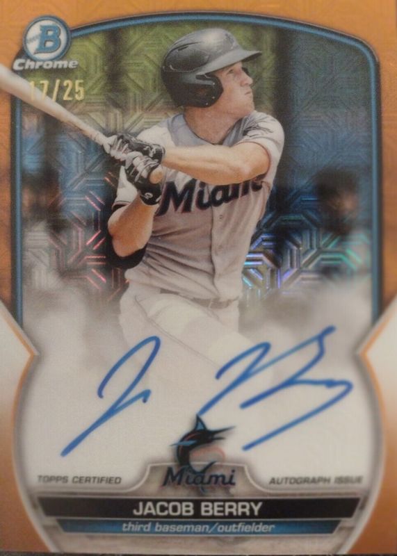 The Jacob Berry 2023 Bowman Mega Box #BMA-JBY Chrome Prospect Auto - Orange Mojo Refractor /25 card in Raw condition has not changed in price in the last 30 days and was last sold for $41.00 .
