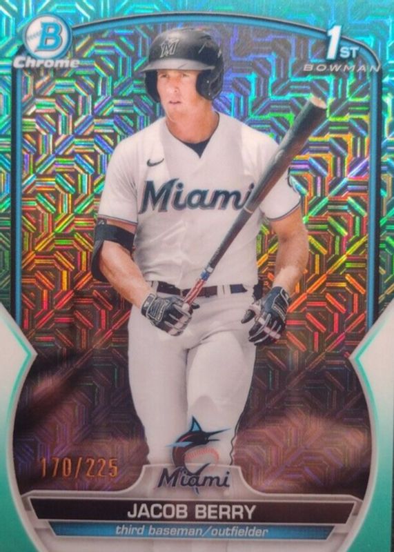 Jacob Berry 2023 Bowman Mega Box #BCP-108 Chrome Prospects - Aqua Mojo Refractor /225 (1st) RAW Price Guide