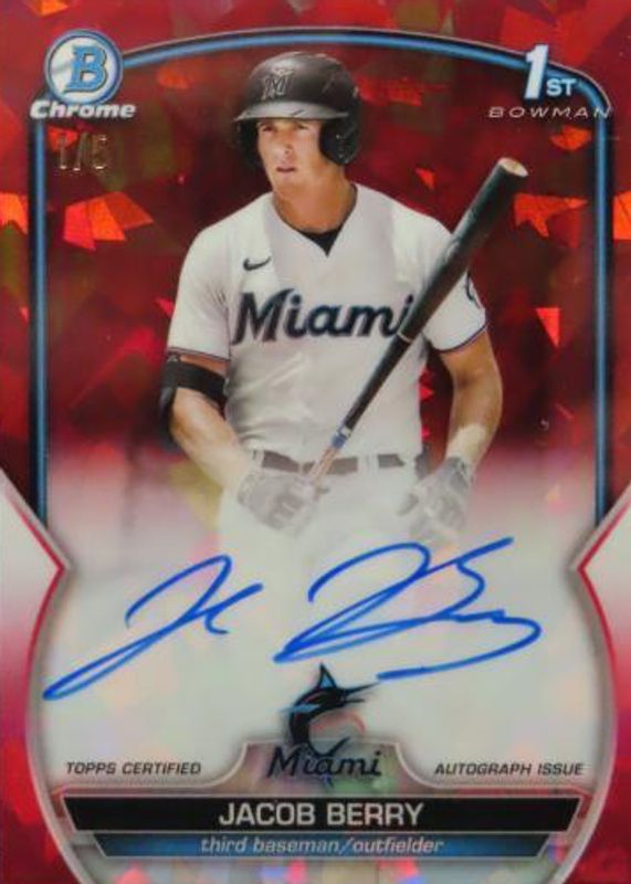 Auctions Ending Soon for Jacob Berry 2023 Bowman Sapphire Edition #BSPA-JB Chrome Prospect Auto - Red /5 (1st) RAW