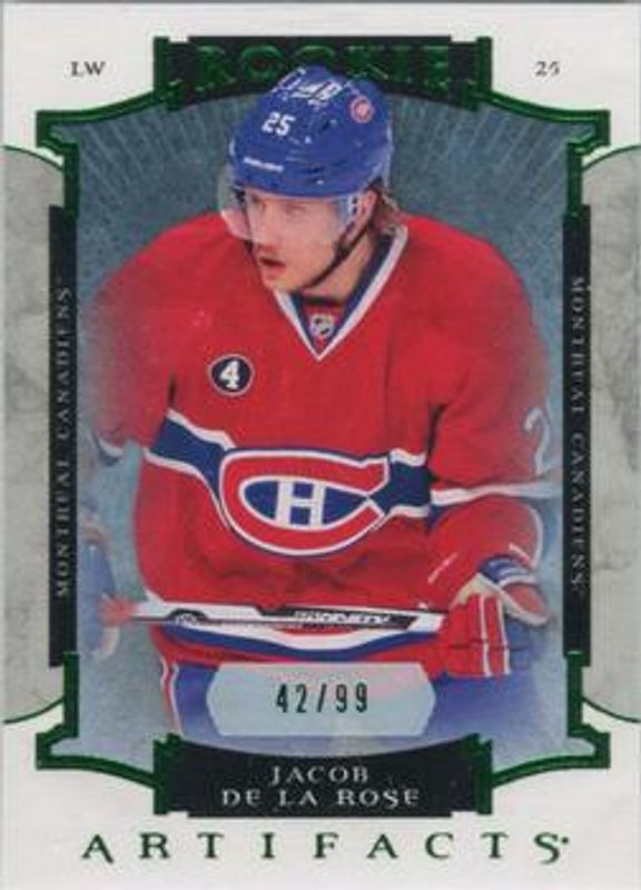 The Jacob de la Rose 2015 Upper Deck Artifacts #176 Emerald /99 Rookie card is 1 of 13 Jacob de la Rose's card variations in the 2015 Upper Deck Artifacts set being tracked by Sports Card Investor, including Base /899, Ruby /399, Auto Materials Silver /125, Materials Silver /125, and Sapphire /85.