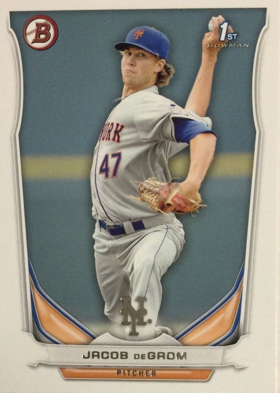 The Jacob deGrom 2014 Bowman #BP-73 Paper Prospects (1st) Rookie card in Raw condition has moved up $1.48 (+59.2%) in the last 30 days and was last sold for $3.99 .