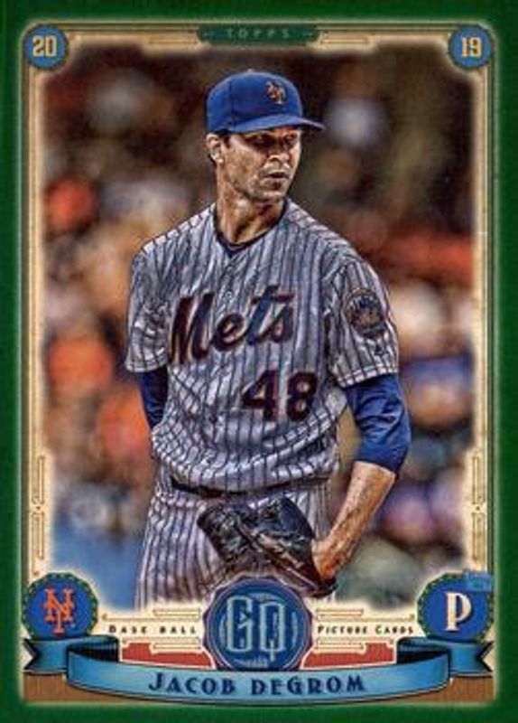 The Jacob deGrom 2019 Topps Gypsy Queen #200 Green card is 1 of 37 Jacob deGrom's card variations in the 2019 Topps Gypsy Queen set being tracked by Sports Card Investor, including Base, Bazooka Back, GQ Logo Swap, Missing Nameplate, and Purple.