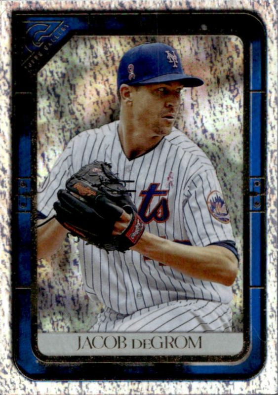 The Jacob deGrom 2021 Topps Gallery #112 Blue Pattern /50 card is 1 of 23 Jacob deGrom's card variations in the 2021 Topps Gallery set being tracked by Sports Card Investor, including Base, Printer Proof, Rainbow Foil, Private Issue /250, and Green /125.