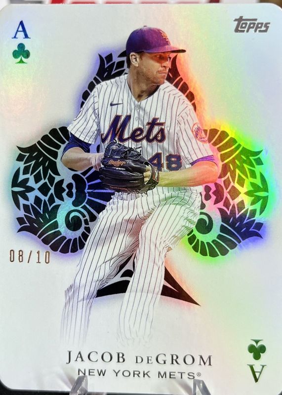 The Jacob deGrom 2023 Topps #AA-8 All Aces - Red /10 (Mets) card in Raw condition has not changed in price in the last 30 days and was last sold for $62.26 .