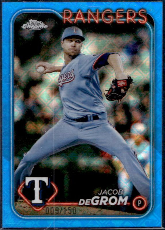 The Jacob deGrom 2024 Topps Chrome Logofractor Edition #228 Blue /150 card is 1 of 10 Jacob deGrom's card variations in the 2024 Topps Chrome Logofractor Edition set being tracked by Sports Card Investor, including Base, Purple /250, Aqua /199, Green /99, and Gold /50.