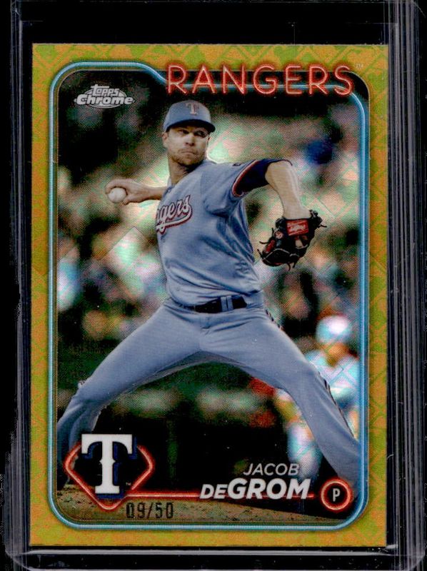 The Jacob deGrom 2024 Topps Chrome Logofractor Edition #228 Gold /50 card is 1 of 10 Jacob deGrom's card variations in the 2024 Topps Chrome Logofractor Edition set being tracked by Sports Card Investor, including Base, Purple /250, Aqua /199, Blue /150, and Green /99.