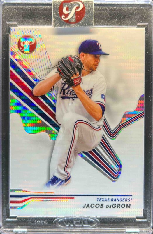 The Jacob deGrom 2024 Topps Pristine #201 Pristine Refractor card is 1 of 18 Jacob deGrom's card variations in the 2024 Topps Pristine set being tracked by Sports Card Investor, including Base, Refractor, Green Refractor /150, Pristine Purple Refractor /99, and Purple Refractor /99.