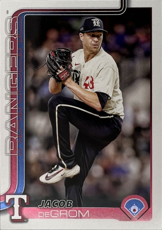 The Jacob deGrom 2025 Topps #208 Base card is 1 of 98 Jacob deGrom's card variations in the 2025 Topps set being tracked by Sports Card Investor, including Aqua Holo Foil, Diamante Foil, Holo Foil, Pink Diamante Foil, and Pink Holo Foil.