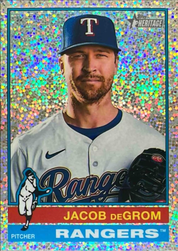 The Jacob deGrom 2025 Topps Heritage #279 Chrome - Silver Sparkle Refractor card is 1 of 24 Jacob deGrom's card variations in the 2025 Topps Heritage set being tracked by Sports Card Investor, including Base, Black Border, Dark Blue Border, Dark Green Border, and Dark Yellow Border.