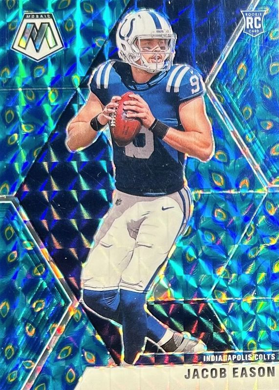 The Jacob Eason 2020 Mosaic #236 Choice Peacock /(SSP) Rookie card in Raw condition has not changed in price in the last 30 days and was last sold for $20.00 .