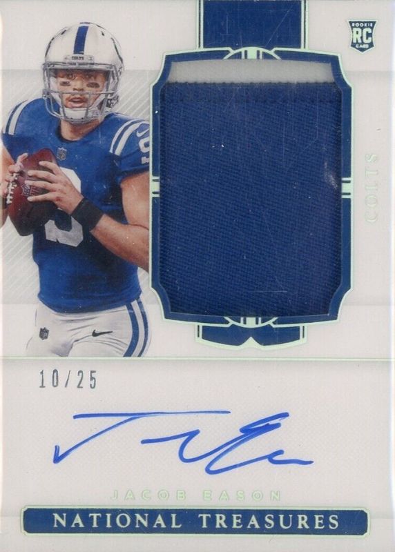 This card is 1 of 49 Jacob Eason's card variations in the 2020 National Treasures set being tracked by Sports Card Investor, including Rookie Patch Auto /99, Rookie Patch Auto - Green Jersey Number (/9), Rookie Patch Auto - Midnight /20, Rookie Patch Auto - Stars & Stripes /20, and Rookie Patch Auto - Holo Gold /10.