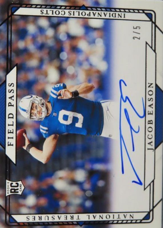 The Jacob Eason 2020 National Treasures #FP-JE Rookie Signatures Field Pass - Black /5 card in Raw condition has not changed in price in the last 30 days and was last sold for $17.27 .