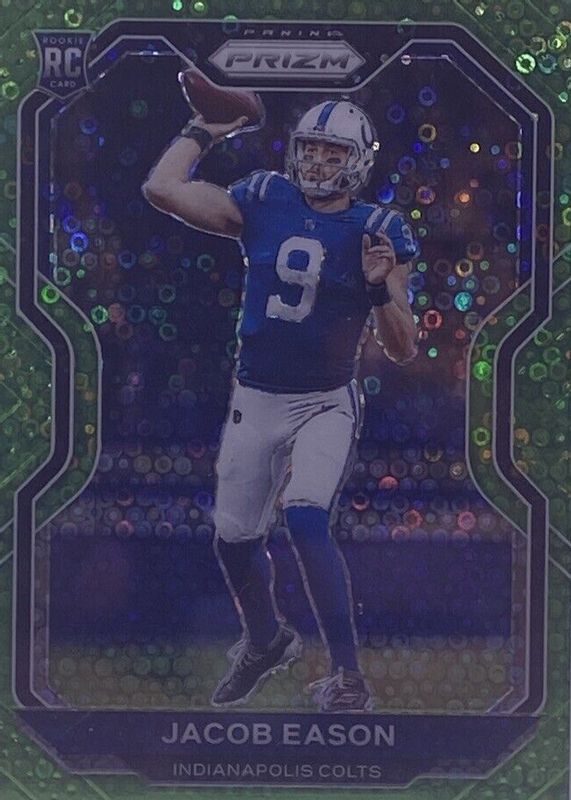 The Jacob Eason 2020 Prizm #331 No Huddle Neon Green /5 Rookie card in Raw condition has not changed in price in the last 30 days and was last sold for $7.50 .