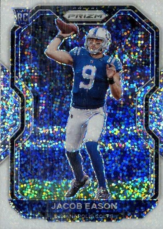 This card is 1 of 63 Jacob Eason's card variations in the 2020 Prizm set being tracked by Sports Card Investor, including Base, Disco, Green, Lazer, and Light Blue.