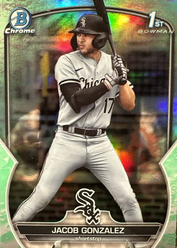 This card is 1 of 44 Jacob Gonzalez's card variations in the 2023 Bowman Draft set being tracked by Sports Card Investor, including Chrome (1st), Chrome - Japan Refractor (1st), Chrome - Pearl Refractor (1st), Chrome - Refractor (1st), and Chrome - Sky Blue Refractor (1st).