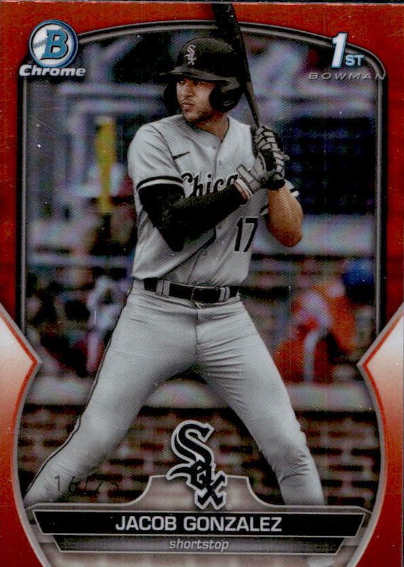 The Jacob Gonzalez 2023 Bowman Draft #BDC-167 Chrome - Orange Refractor /25 (1st) card in Raw condition has not changed in price in the last 30 days and was last sold for $42.00 .