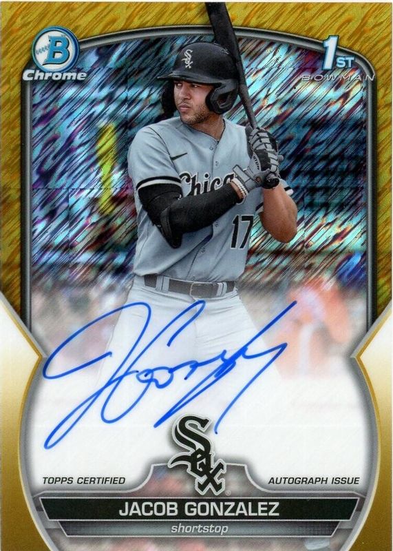 The Jacob Gonzalez 2023 Bowman Draft #CDA-JGO Chrome Prospect Auto - Gold Shimmer Refractor /50 (1st) card in Raw condition has not changed in price in the last 30 days and was last sold for $137.50 .