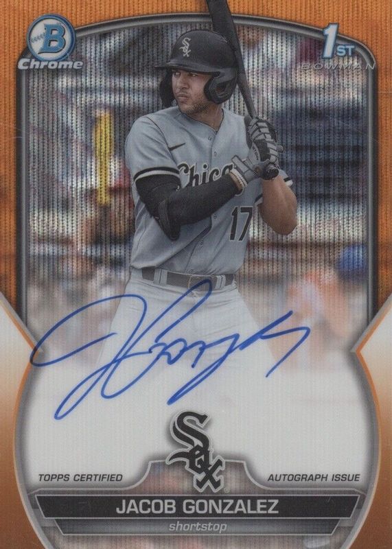 Best Prices Available For Sale of Jacob Gonzalez 2023 Bowman Draft #CDA-JGO Chrome Prospect Auto - Orange Wave Refractor /25 (1st)