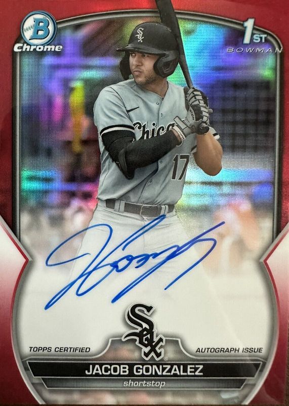 Auctions Ending Soon for Jacob Gonzalez 2023 Bowman Draft #CDA-JGO Chrome Prospect Auto - Red Lava Refractor /5 (1st) RAW
