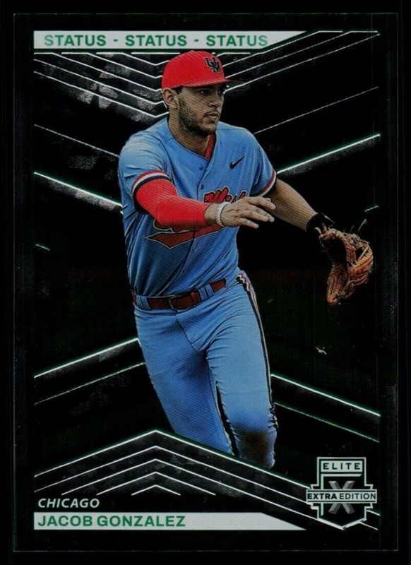 The Jacob Gonzalez 2023 Elite Extra Edition #4 Status Green /499 card is 1 of 181 Jacob Gonzalez's card variations in the 2023 Elite Extra Edition set being tracked by Sports Card Investor, including #168 Base, #4 Base, #168 Pink, #4 Pink, and #168 Signatures.