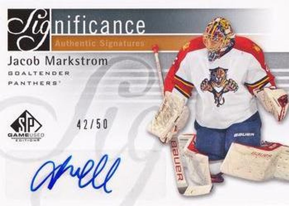 The Jacob Markstrom 2011 SP Game Used #SIG-JM SIGnificance /50 card is 1 of 3 Jacob Markstrom's card variations in the 2011 SP Game Used set being tracked by Sports Card Investor, including Letter Marks /50, and Number Marks /25.