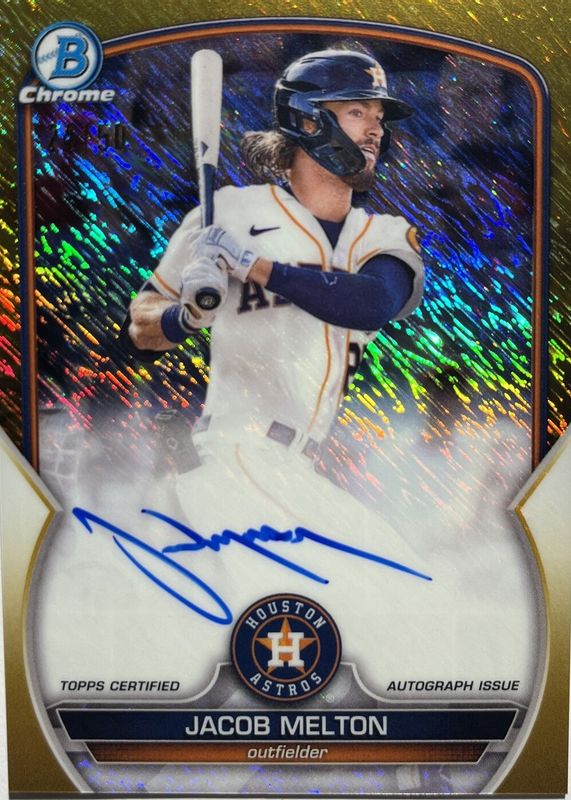Auctions Ending Soon for Jacob Melton 2023 Bowman Chrome #CPA-JML Prospect Auto - Gold Shimmer Refractor /50 RAW