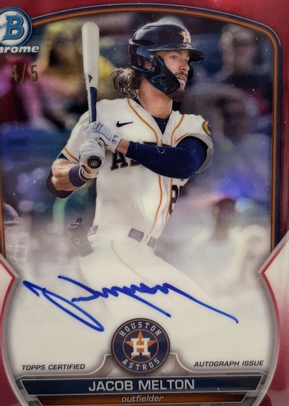 Auctions Ending Soon for Jacob Melton 2023 Bowman Chrome #CPA-JML Prospect Auto - Red Refractor /5 RAW