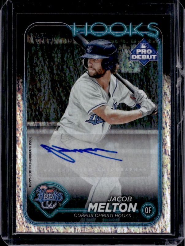 The Jacob Melton 2024 Topps Pro Debut #PD-30 Base Autographs - Sparkle Foil /199 card is 1 of 37 Jacob Melton's card variations in the 2024 Topps Pro Debut set being tracked by Sports Card Investor, including Base, Fuchsia Foil /199, Sparkle Foil /175, Blue Foil /150, and Green Foil /99.