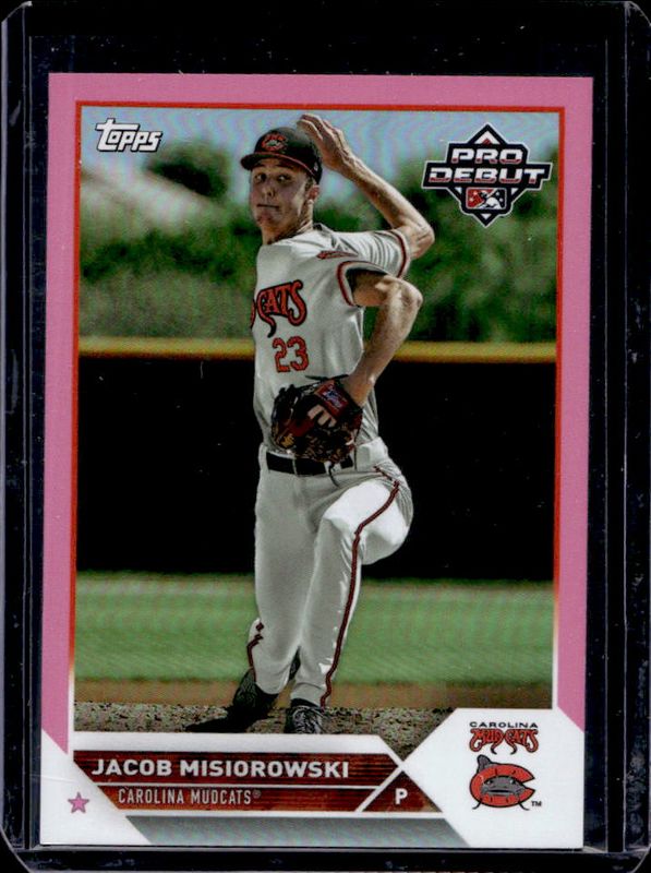 The Jacob Misiorowski 2023 Topps Pro Debut #PD-72 Fuchsia /199 card is 1 of 20 Jacob Misiorowski's card variations in the 2023 Topps Pro Debut set being tracked by Sports Card Investor, including Base, Sparkle /175, Blue /150, Green /99, and Aqua /75.