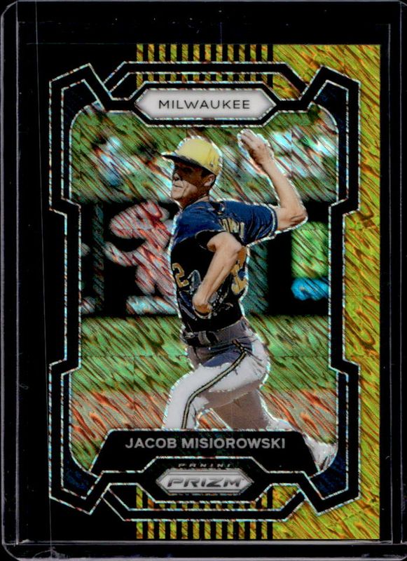 The Jacob Misiorowski 2024 Prizm #114 Black Gold Shimmer FOTL /3 card is 1 of 38 Jacob Misiorowski's card variations in the 2024 Prizm set being tracked by Sports Card Investor, including Base, Blue Ice, Green, Green Ice, and Pink Ice.