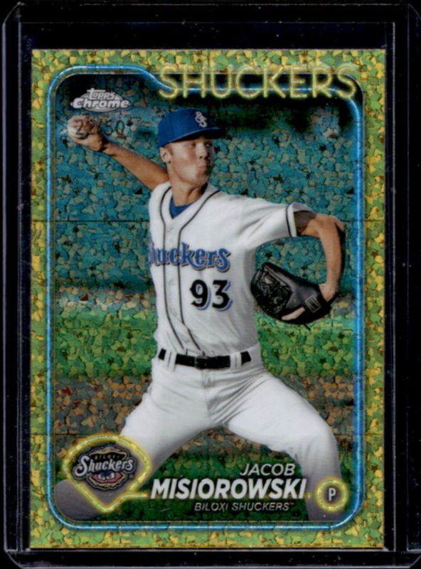 The Jacob Misiorowski 2024 Topps Pro Debut #PDC-171 Chrome - Gold Mini Diamond Refractor /50 card is 1 of 37 Jacob Misiorowski's card variations in the 2024 Topps Pro Debut set being tracked by Sports Card Investor, including Base, Fuchsia Foil /199, Sparkle Foil /175, Blue Foil /150, and Green Foil /99.