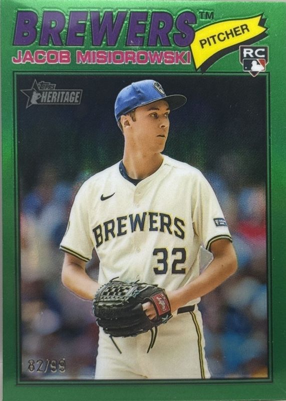 The Jacob Misiorowski 2026 Topps Heritage #144 Chrome - Green Refractor /99 Rookie card in Raw condition has not changed in price in the last 30 days and was last sold for $64.99 .