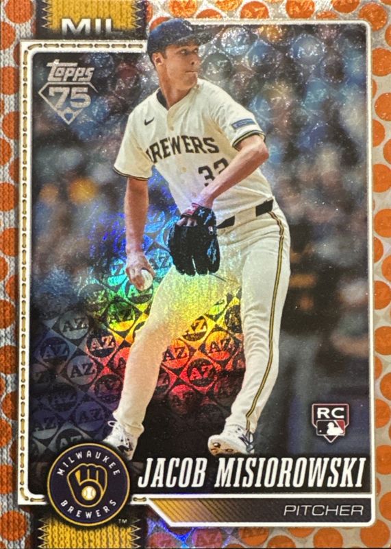 The Jacob Misiorowski 2026 Topps #10 Orange Spring Training /25 Rookie card in Raw condition has not changed in price in the last 30 days and was last sold for $115.00 .