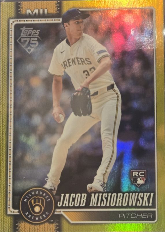 The Jacob Misiorowski 2026 Topps #10 Yellow Rainbow Foil /399 Rookie card in Raw condition has moved down -$9.24 (-30.8%) in the last 30 days and was last sold for $20.76 .