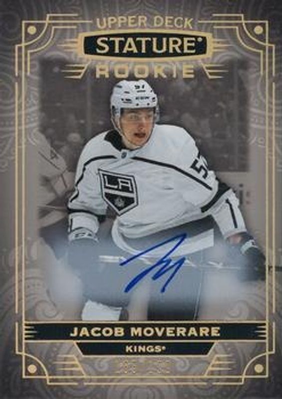 The Jacob Moverare 2022 Upper Deck Stature #144 Autographs /99 Rookie card is 1 of 48 Jacob Moverare's card variations in the 2022 Upper Deck Stature set being tracked by Sports Card Investor, including Base /399, Green /99, Photo Variant /99, Red /75, and Photo Variant Green /66.