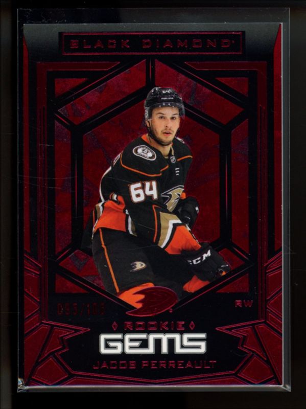 The Jacob Perreault 2022 Upper Deck Black Diamond #RG-JP Rookie Gems - Red /100 card is 1 of 35 Jacob Perreault's card variations in the 2022 Upper Deck Black Diamond set being tracked by Sports Card Investor, including Base /349, Diamond Relic Rookie Gems /99, Red /75, Diamond Relic Rookie Gems Ruby /49, and Blue /25.