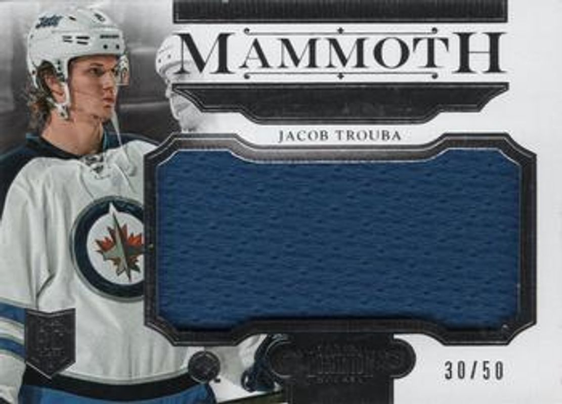 The Jacob Trouba 2013 Panini Rookie Anthology #M-JTR 2013 Panini Dominion Update: Mammoth Jersey /50 card is 1 of 41 Jacob Trouba's card variations in the 2013 Panini Rookie Anthology set being tracked by Sports Card Investor, including Base /249, Purple /1, 2013 Panini Update, 2013 Panini Update:, and 2013 Panini Update: Rookie Autographs.