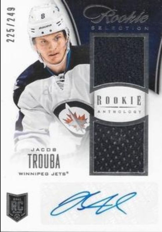The Jacob Trouba 2013 Panini Rookie Anthology #193 Base /249 card is 1 of 41 Jacob Trouba's card variations in the 2013 Panini Rookie Anthology set being tracked by Sports Card Investor, including Purple /1, 2013 Panini Update, 2013 Panini Update:, 2013 Panini Update: Rookie Autographs, and 2013 Panini Update: Rookie Autographs Spring Expo Cracked Ice - Black.