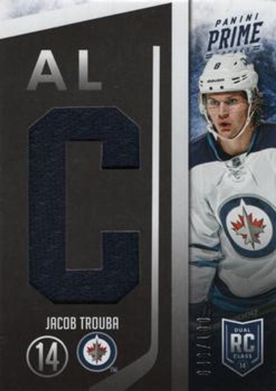 The Jacob Trouba 2013 Prime #14-JTR Dual Rookie Class '14 Jerseys /100 card is 1 of 25 Jacob Trouba's card variations in the 2013 Prime set being tracked by Sports Card Investor, including Base /199, Holo Silver /50, Holo Gold /25, Black /3, and Prime Signatures /99.