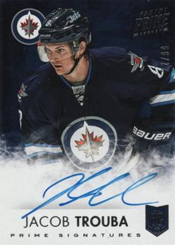 The Jacob Trouba 2013 Prime #S-JTR Prime Signatures /99 Rookie card is 1 of 25 Jacob Trouba's card variations in the 2013 Prime set being tracked by Sports Card Investor, including Base /199, Holo Silver /50, Holo Gold /25, Black /3, and Dual Rookie Class '14 Jerseys /100.