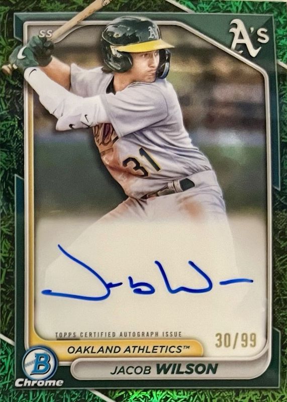 The Jacob Wilson 2024 Bowman #CPA-JWI Chrome Prospect Auto - Green Grass Refractor /99 card in Raw condition has not changed in price in the last 30 days and was last sold for $199.99 .