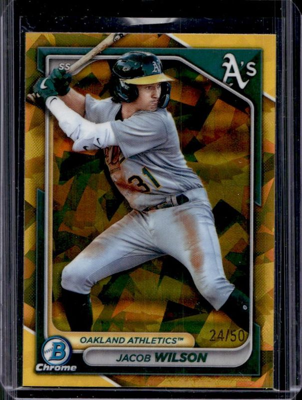 The Jacob Wilson 2024 Bowman Sapphire Edition #BCP-3 Gold /50 card is 1 of 15 Jacob Wilson's card variations in the 2024 Bowman Sapphire Edition set being tracked by Sports Card Investor, including Base, Green /99, Yellow /75, Orange /25, and Black /10.