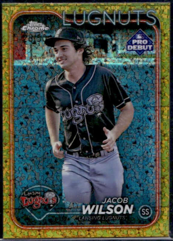 The Jacob Wilson 2024 Topps Pro Debut #PDC-40 Chrome - Gold Mini Diamond Refractor /50 card is 1 of 50 Jacob Wilson's card variations in the 2024 Topps Pro Debut set being tracked by Sports Card Investor, including Base, Fuchsia Foil /199, Sparkle Foil /175, Blue Foil /150, and Green Foil /99.