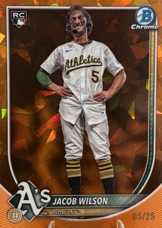 The Jacob Wilson 2025 Bowman Chrome Sapphire Edition #1 Image Variation - Orange /25 Rookie card in Raw condition has not changed in price in the last 30 days and was last sold for $200.00 .
