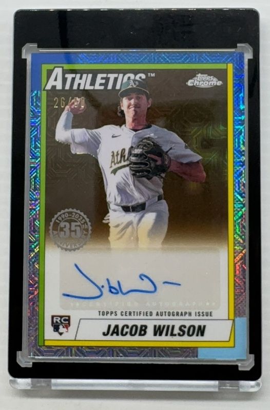 The Jacob Wilson 2025 Topps #90CA-JW 1990 Baseball Chrome Silver Pack Autographs (Series 1) - Gold Refractor /50 Rookie card is 1 of 184 Jacob Wilson's card variations in the 2025 Topps set being tracked by Sports Card Investor, including Base, Aqua Holo Foil, Aqua Rainbow, Diamante Foil, and Eggs.