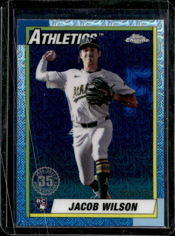 The Jacob Wilson 2025 Topps #T90C-16 1990 Baseball Chrome Silver Pack - Blue Refractor /150 Rookie card is 1 of 184 Jacob Wilson's card variations in the 2025 Topps set being tracked by Sports Card Investor, including Base, Aqua Holo Foil, Aqua Rainbow, Diamante Foil, and Eggs.